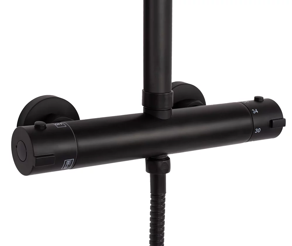Характеристики данной душевой системы могут включать в себя различные режимы струи для персонализированного комфорта, удобный душевой гарнитур и термостатический смеситель для точной регулировки температуры воды. Матовая черная отделка добавляет современный шарм и придает системе индивидуальность.