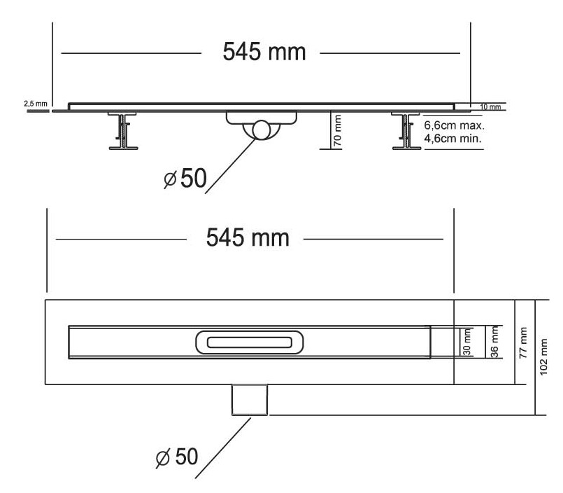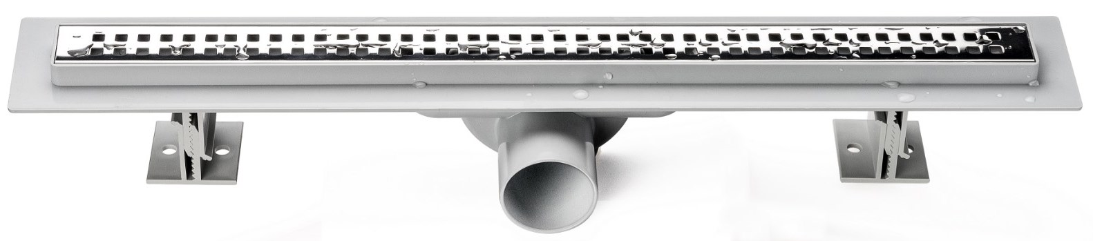 Дренажный канал из ABS-пластика, противозапаховый затвор, решетка из нержавеющей стали 1 мм, комплект регулируемых по высоте опор, пластиковый сервисный ключ.