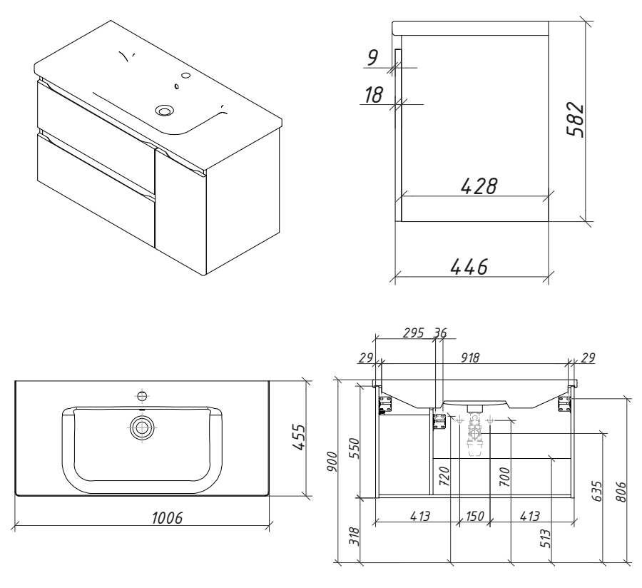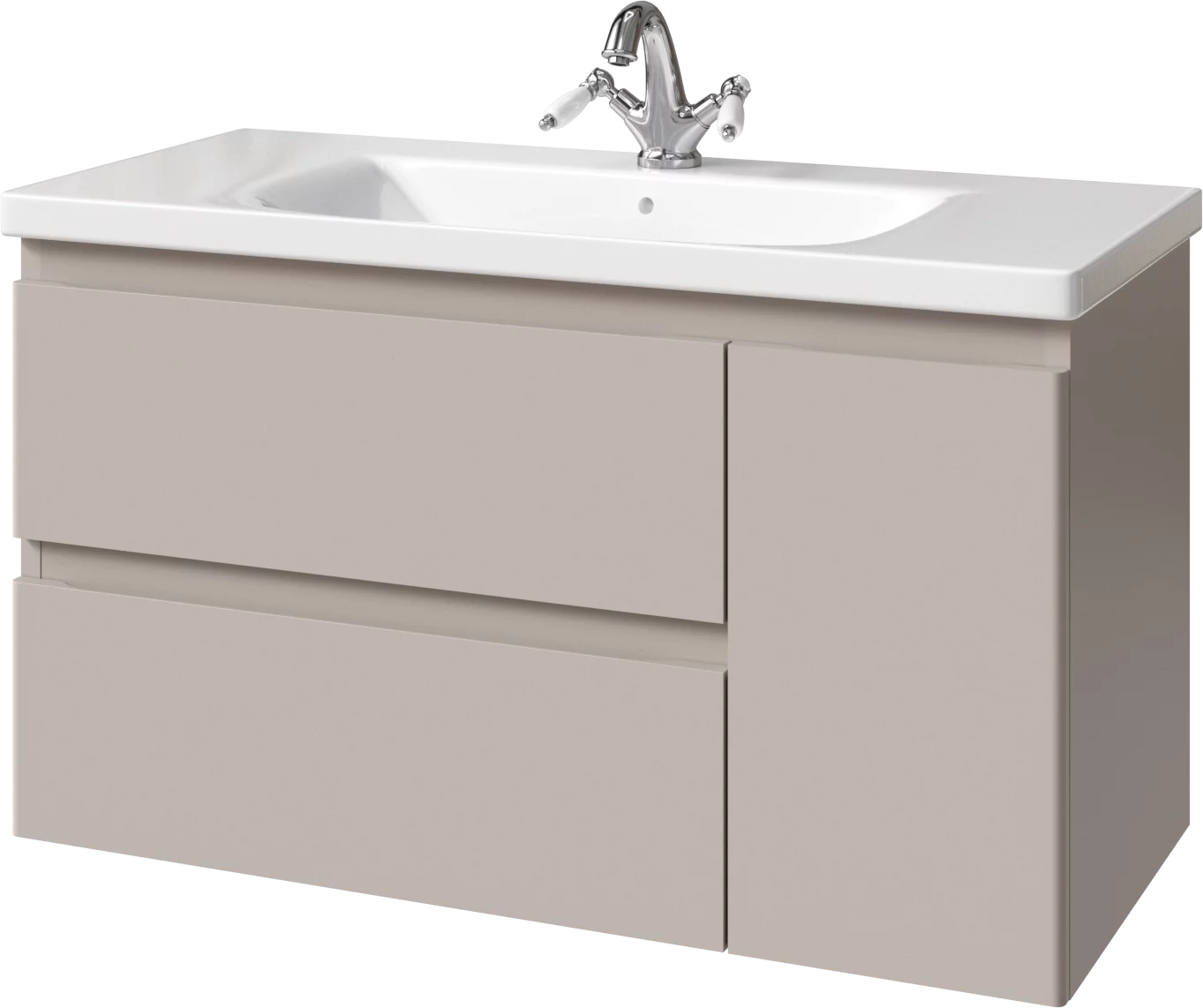 Тумба подвесная для раковины 100см с 2 ящиками и 1 дверью (справа). Ручки интегрированные в фасадах. Выпускается в Матовых и Текстурированных отделках из реестра MODERN (ограничение по глянцевым отделкам).