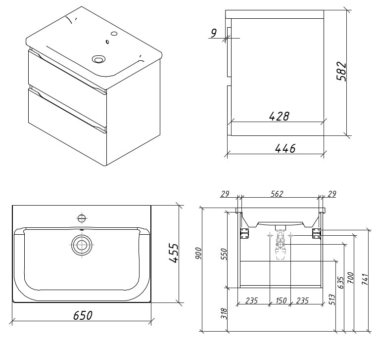 Тумба подвесная для раковины 65 см с 2 ящиками. Ручки интегрированные в фасадах. Выпускается в Матовых и Текстурированных отделках из реестра MODERN (ограничение по глянцевым отделкам).