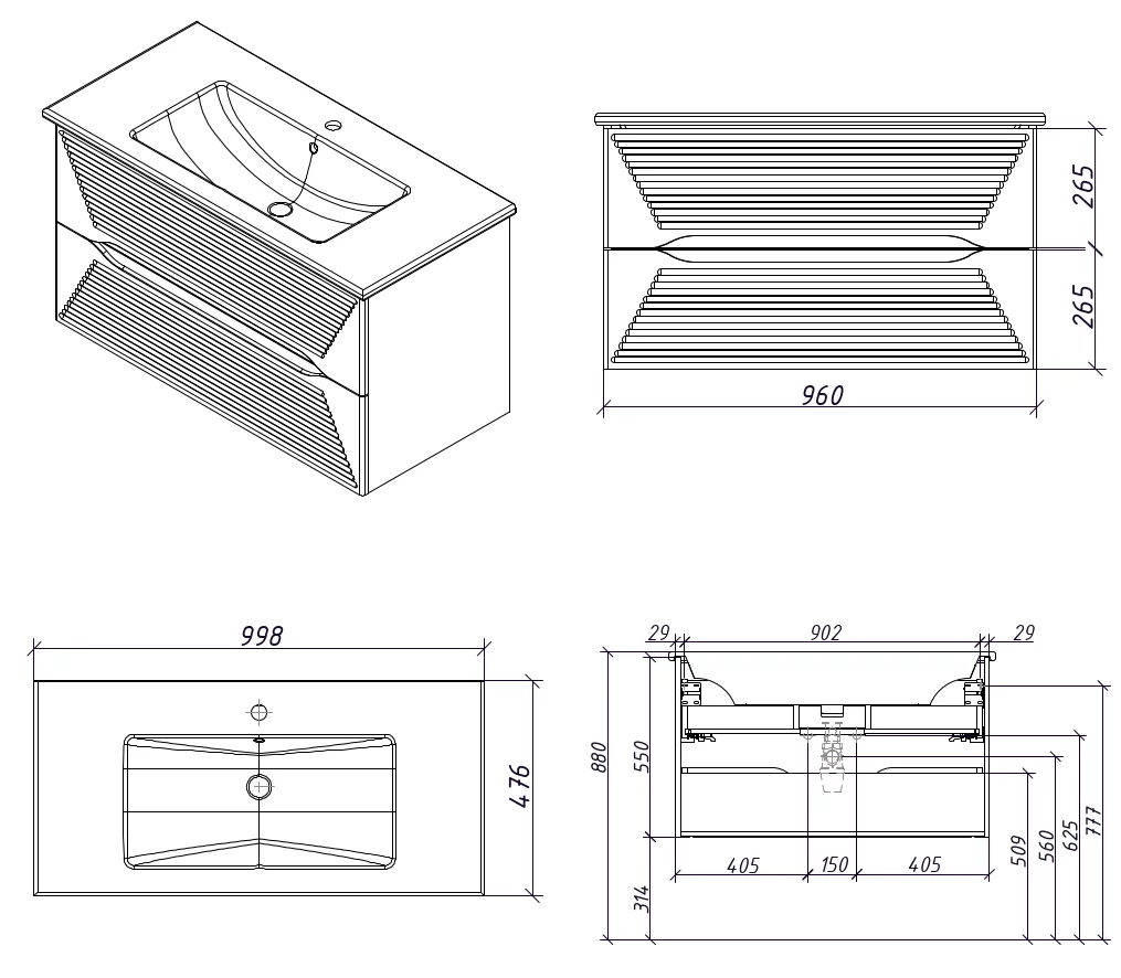 Тумба подвесная для раковины 100 см с 2 ящиками.