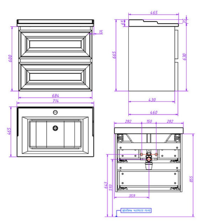 Тумба подвесная для раковины 70 см, 2 ящика, фасад с филенкой. Выпуск в отделках Эмалями из реестра CLASSIC. Варианты раковин: Y-070В