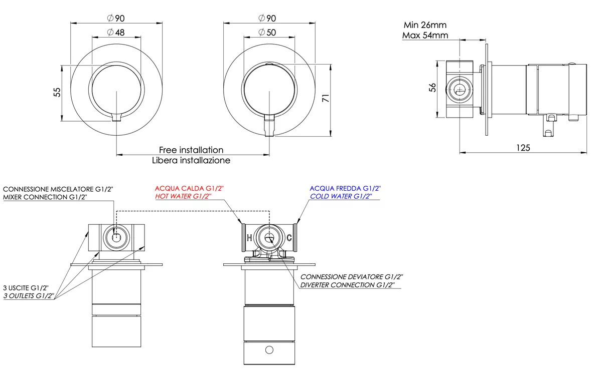В комплекте идет скрытая часть, что упрощает установку. Этот смеситель предназначен для работы с тремя потребителями, что позволяет подключить верхний душ, ручной душ и излив для ванны.