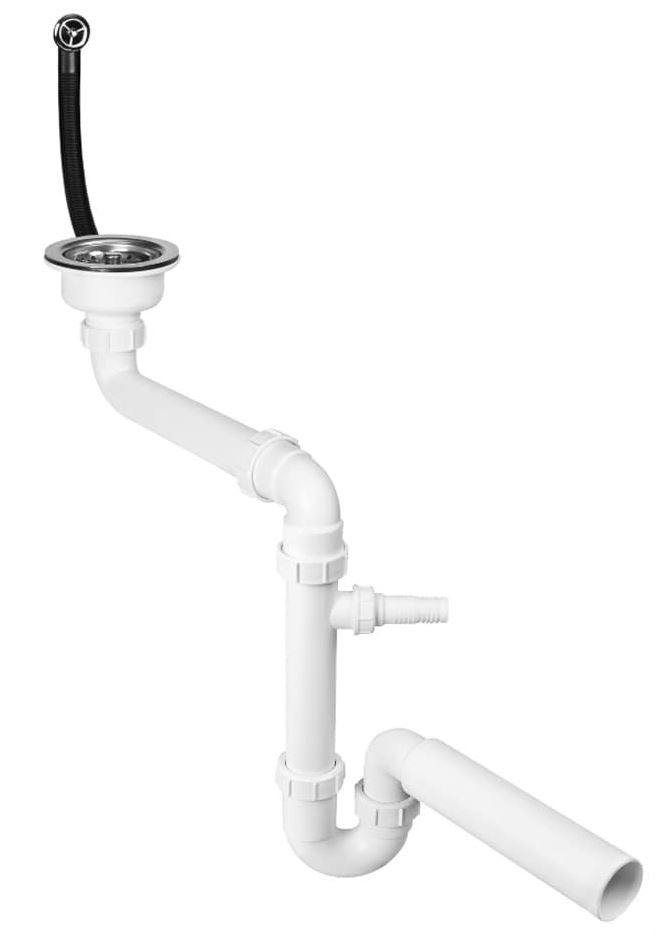 Трубный сифон для мойки 1,1/2х50мм со сливом 1,1/2х113мм, с круглым переливом, с подключением к стиральной или посудомоечной машине, с удлинителем, позволяющим использовать пространство под раковиной.