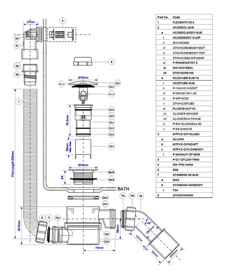 Сифон в ванну и глубокий лоток позволяет очистки от верхней части. Комплект оснащен системой открытия и закрытия "клик-клак". Отход 1.1 / 2 "х40 / 50 мм. Передача и длина кабеля 700-1000 мм.