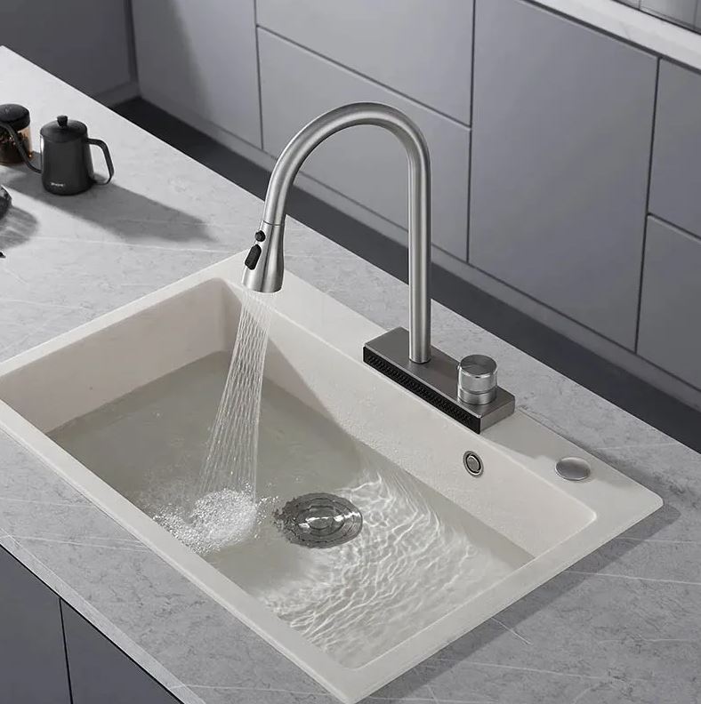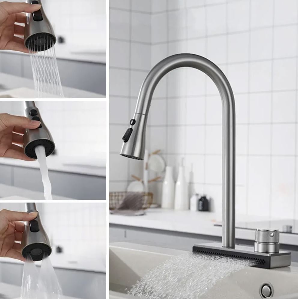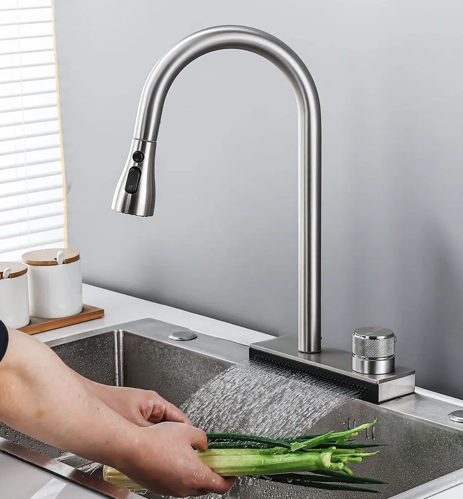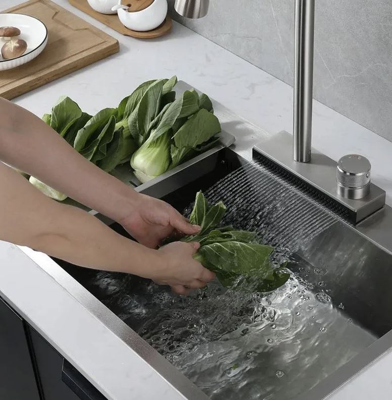 Дополнительно в смеситель встроена водопадная струя, что увеличивает функциональность смесителя и позволяет удобно мыть овощи и фрукты, а также ополаскивать посуду.