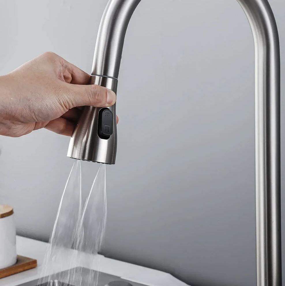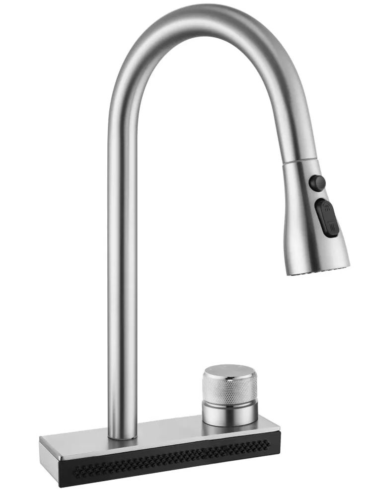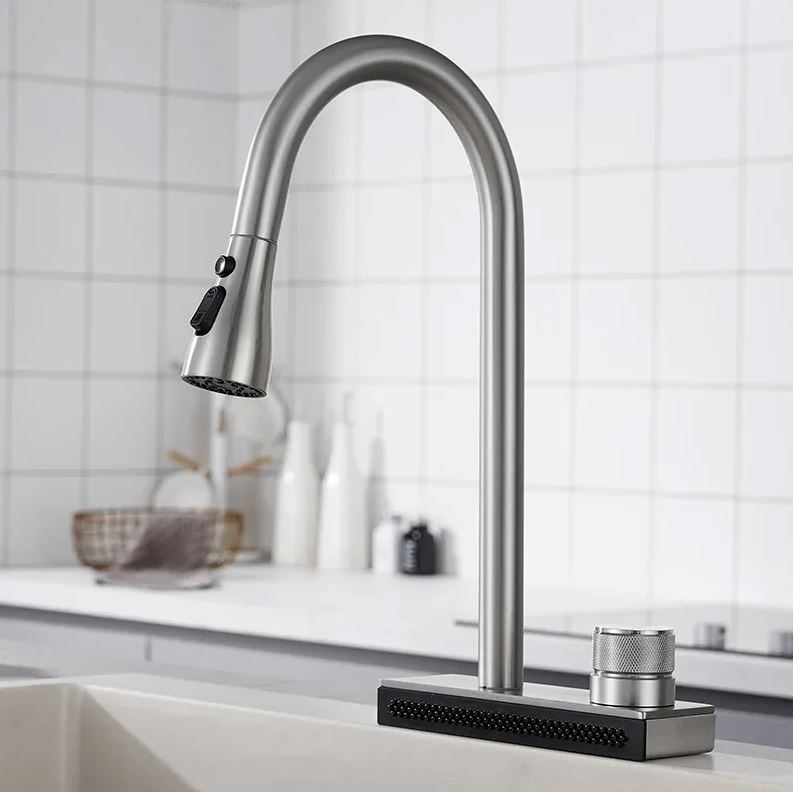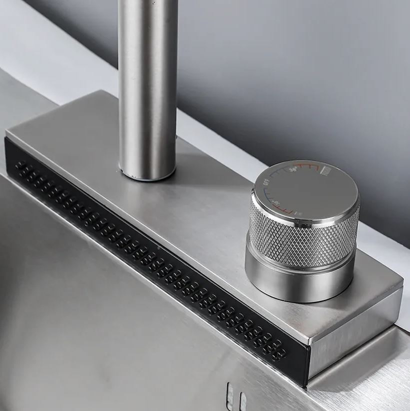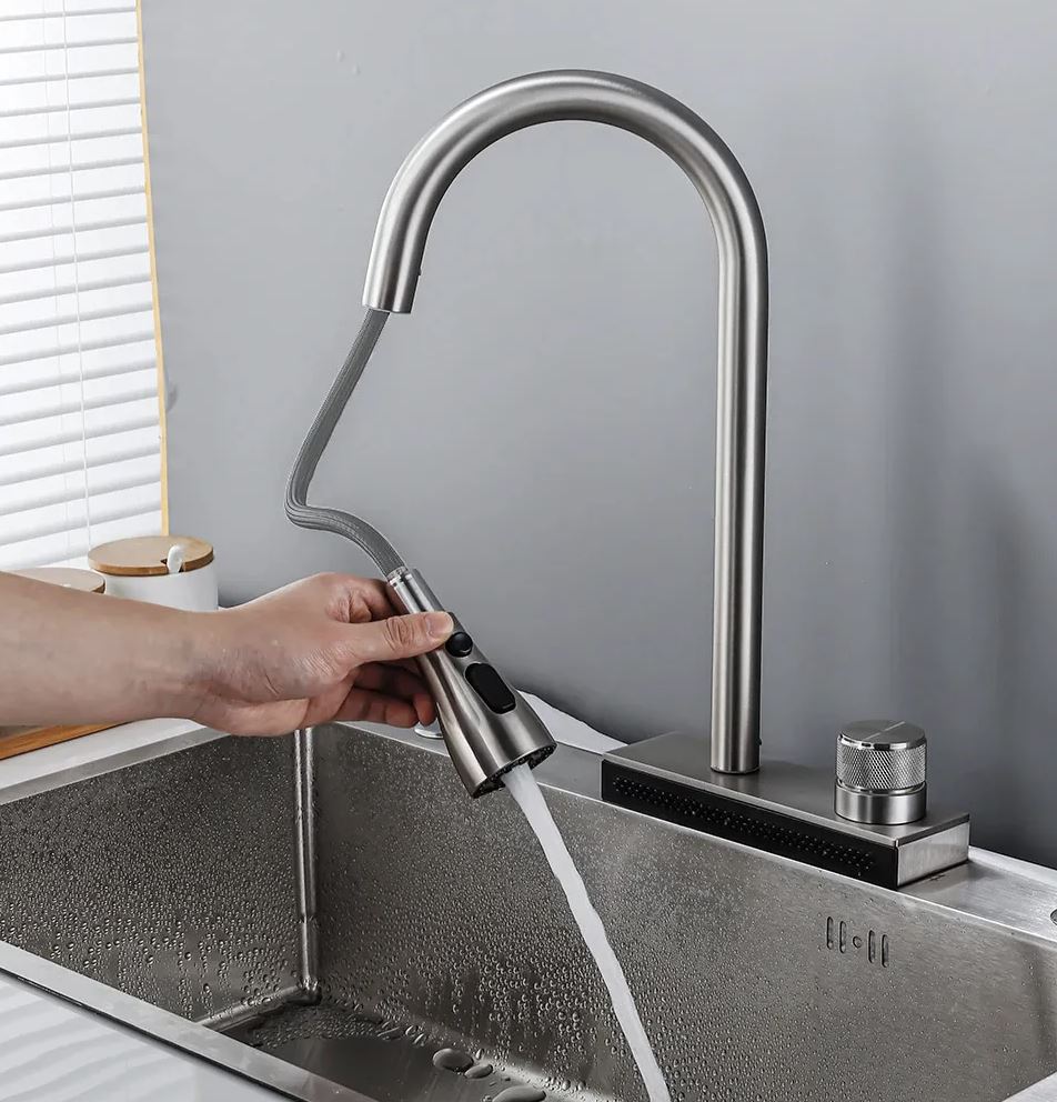 Дополнительно в смеситель встроена водопадная струя, что увеличивает функциональность смесителя и позволяет удобно мыть овощи и фрукты, а также ополаскивать посуду.