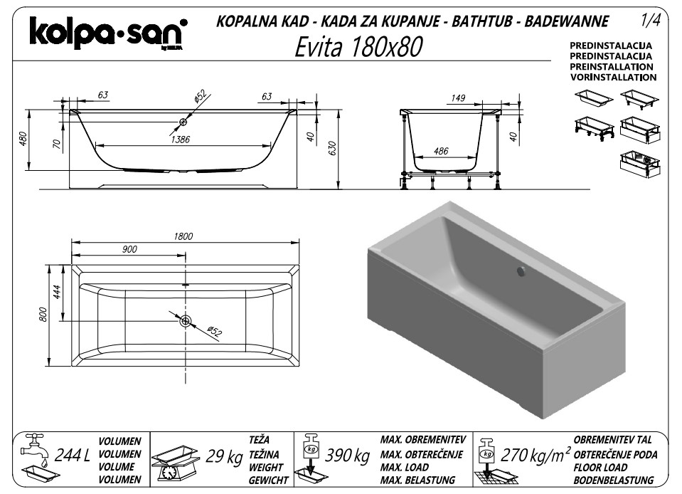 Ванна акриловая Kolpa-San Evita 180Х80